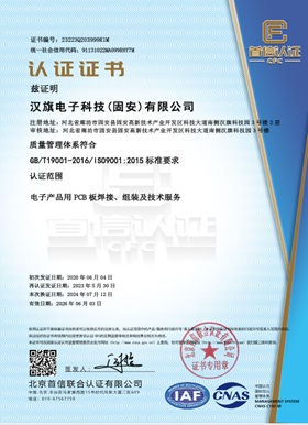 多年来,汉旗电子科技(固安)有限公司积极融入到京津冀一体化协同发展中。汉旗科技深扎固安,辐射京津冀,服务全球客户,业务实现稳步增长,先后获得高新技术企业,科技型中小企业,军民融合企业,专精特新企业,政府质量奖,廊坊市优秀民营企业等荣誉称号。公司先后通过了ISO9001质量管理体系认证、ISO14001环境管理体系认证、IATF16949汽车电子质量管理体系认证、GJB9001武器装备质量管理体系认证、ISO13485医疗器械质量管理体系认证、ISO45001职业健康体系认证。